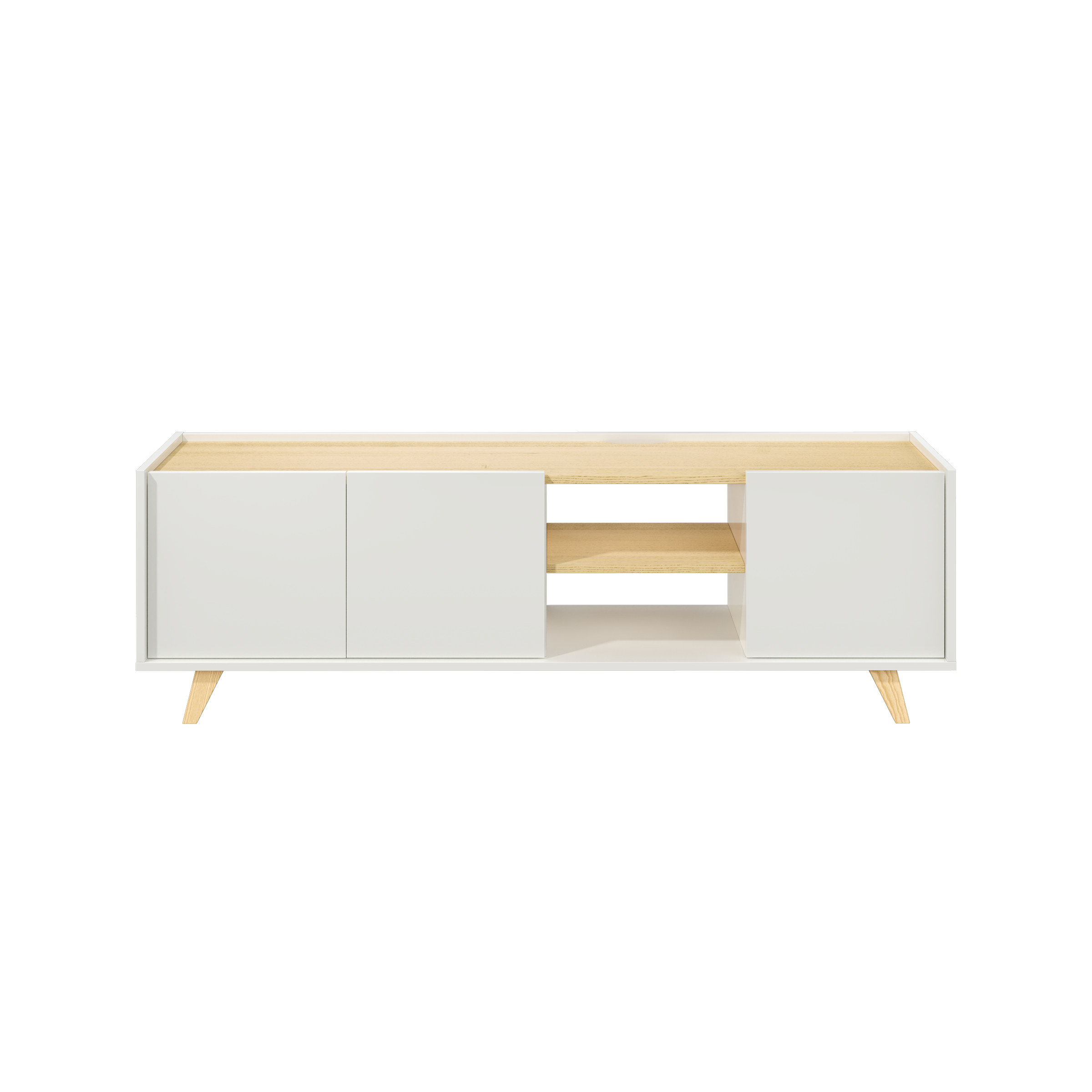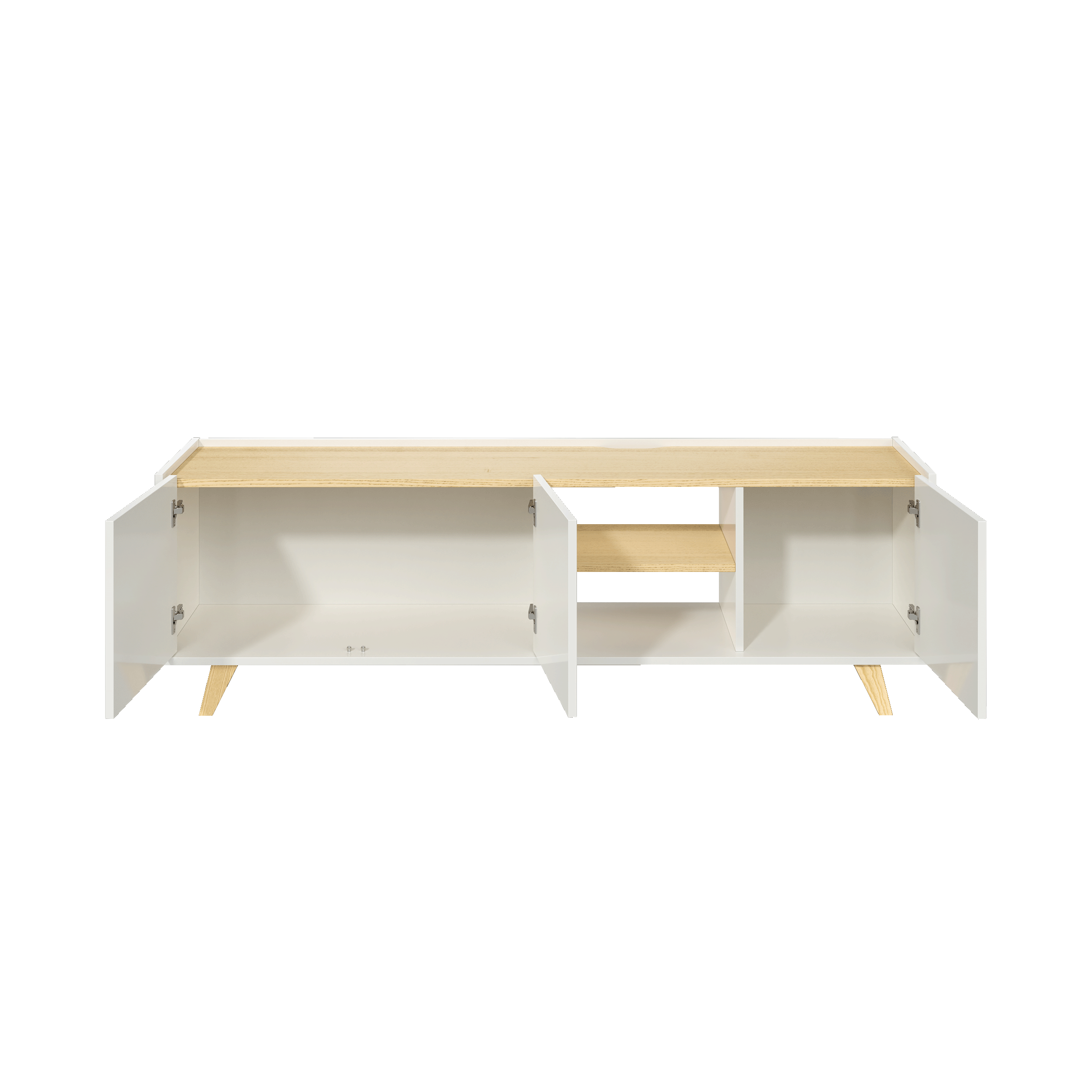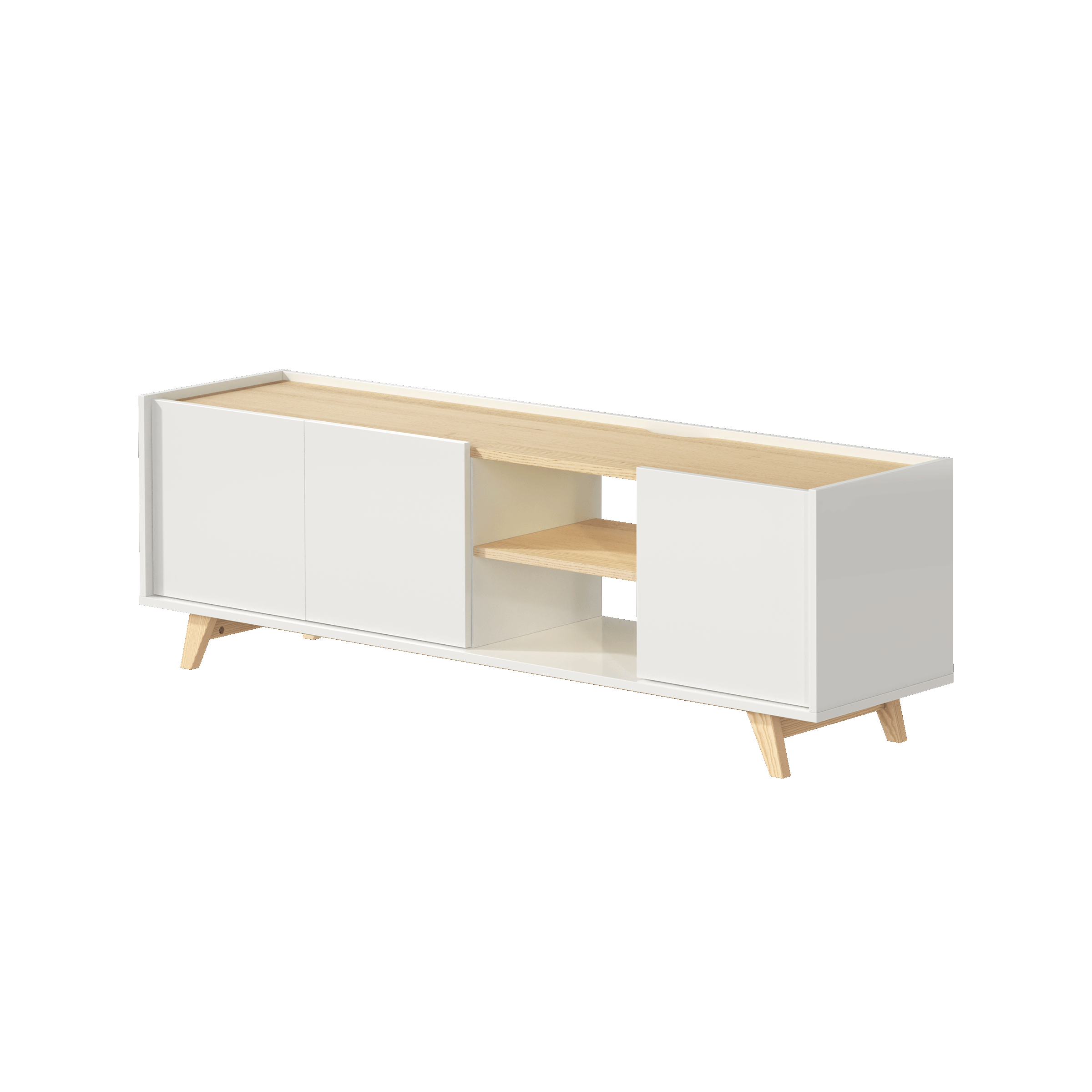 - Base de TV com arrumação garantida nos três compartimentos com porta e espaços abertos para colocação de aparelhos eletrónicos que exijam comando e passagem de cabos.