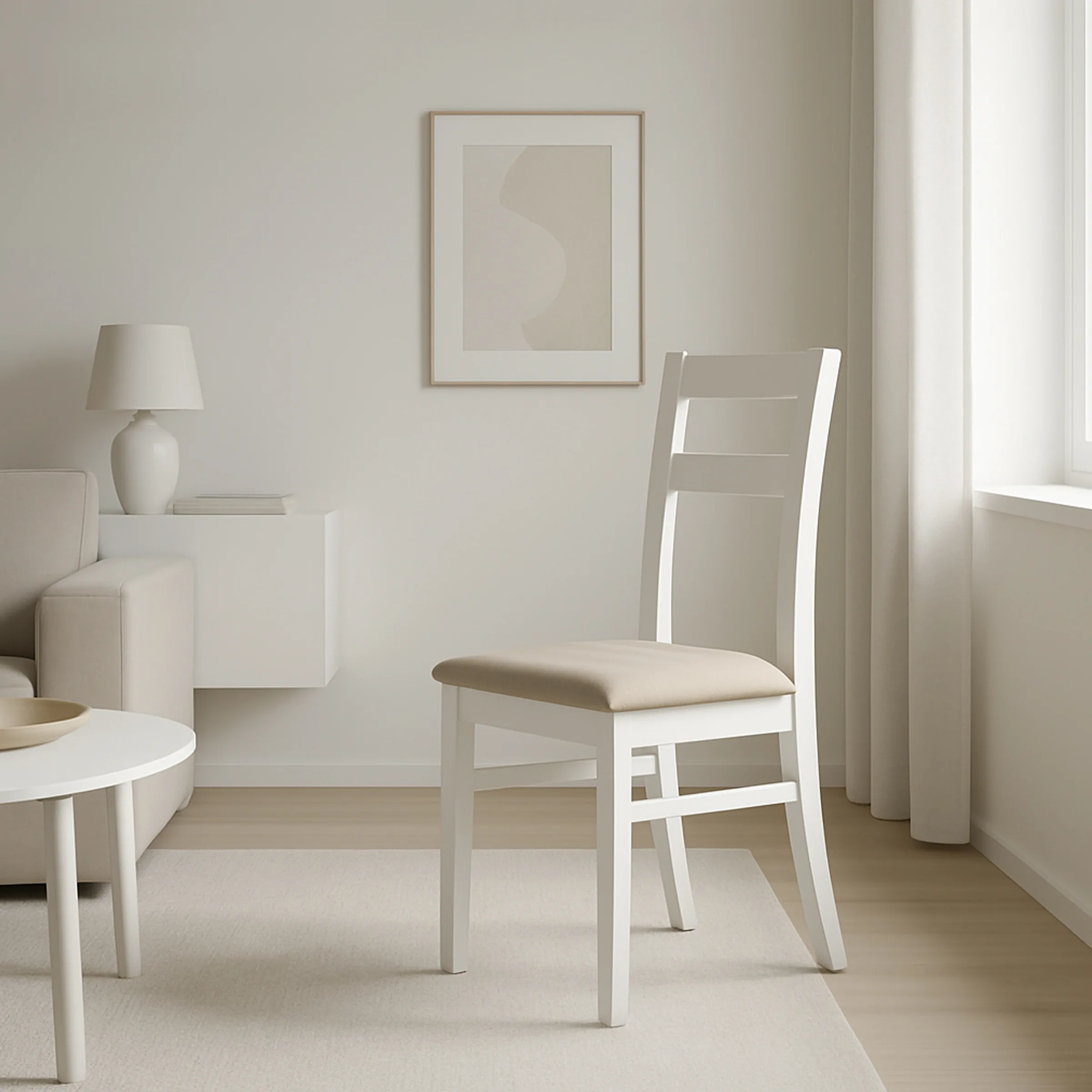 • Acabamento em madeira lacada a branco, que confere um toque moderno e leve ao ambiente.