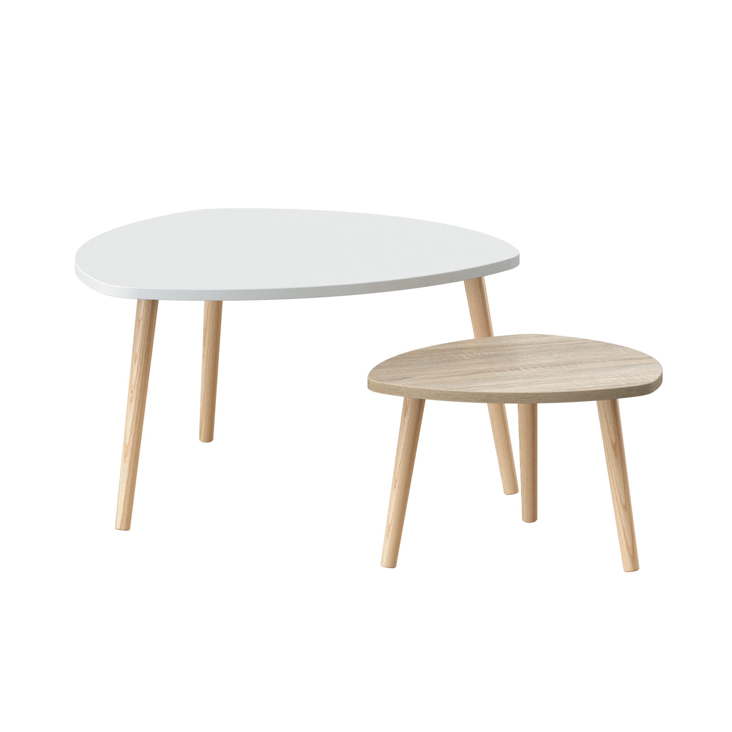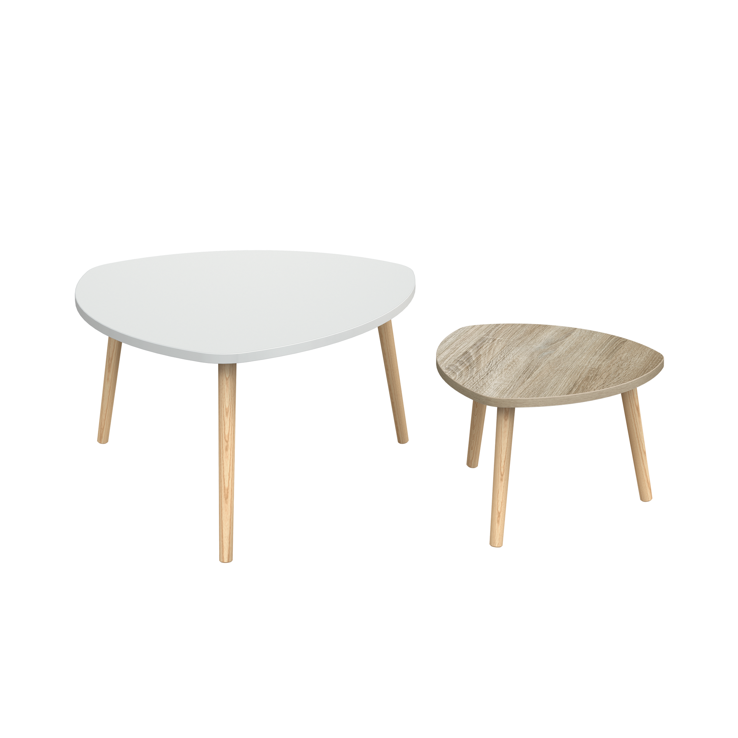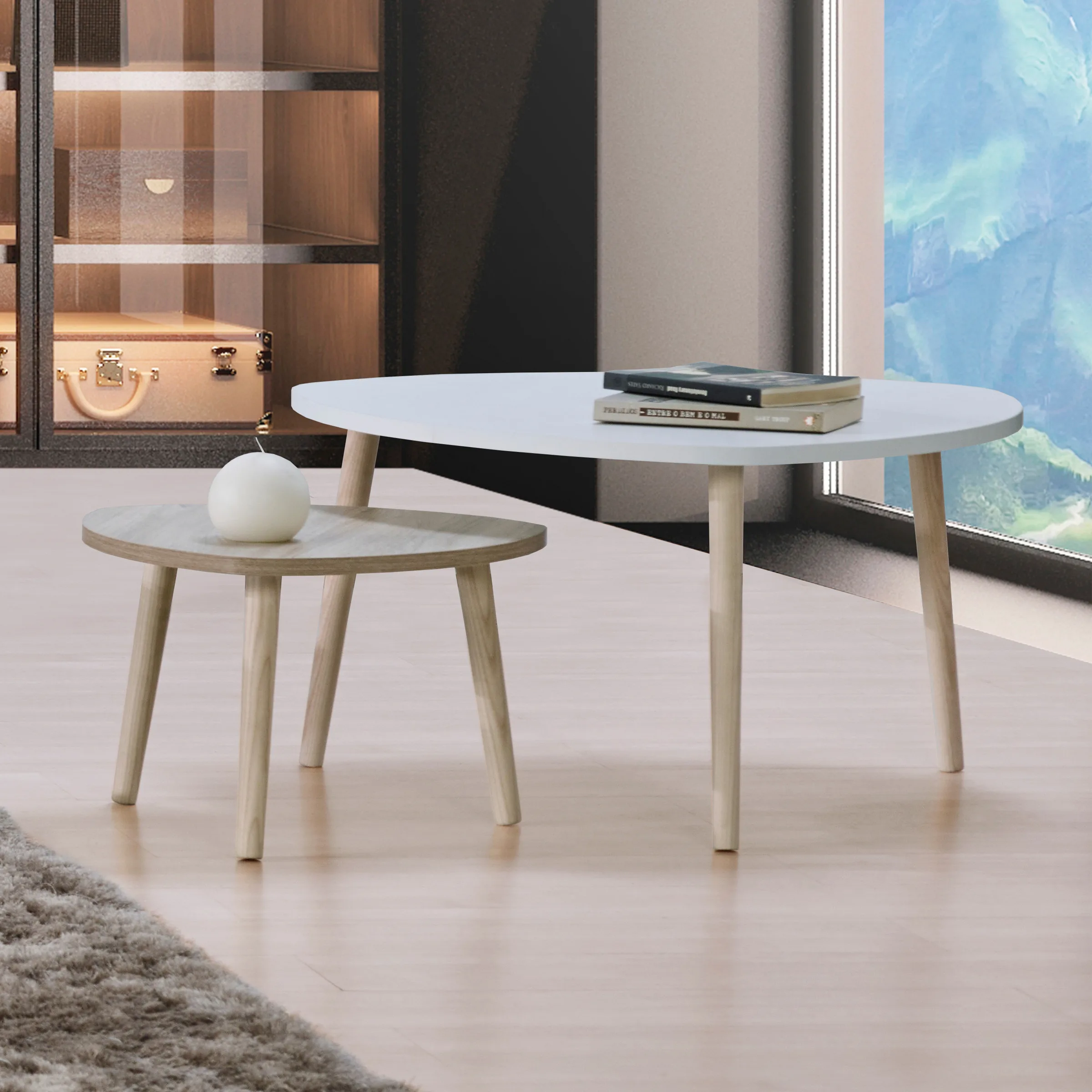 - A forma irregular dá personalidade a estas duas mesas de centro, que podem ser usadas de forma individual ou em conjunto, para racionalizar o espaço.