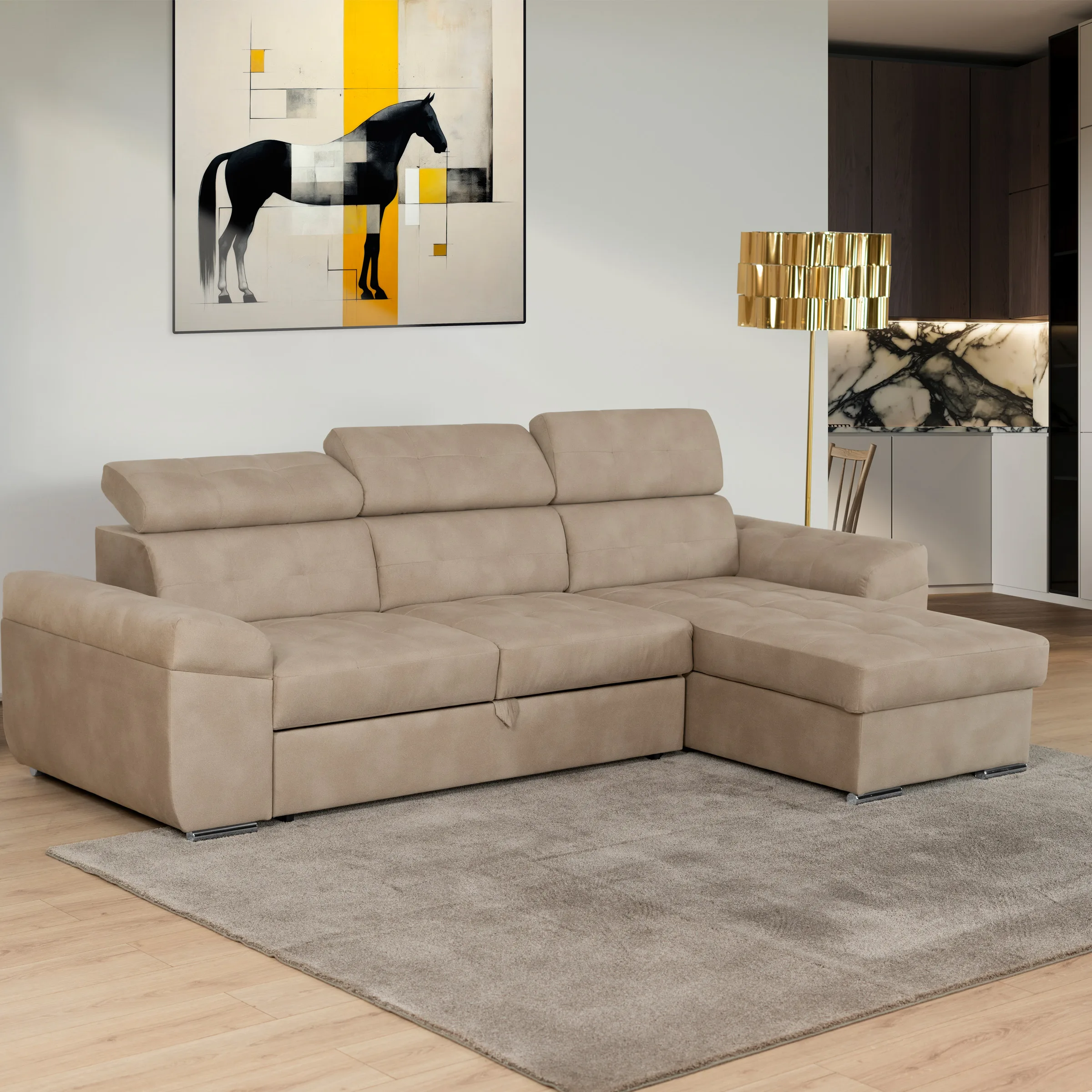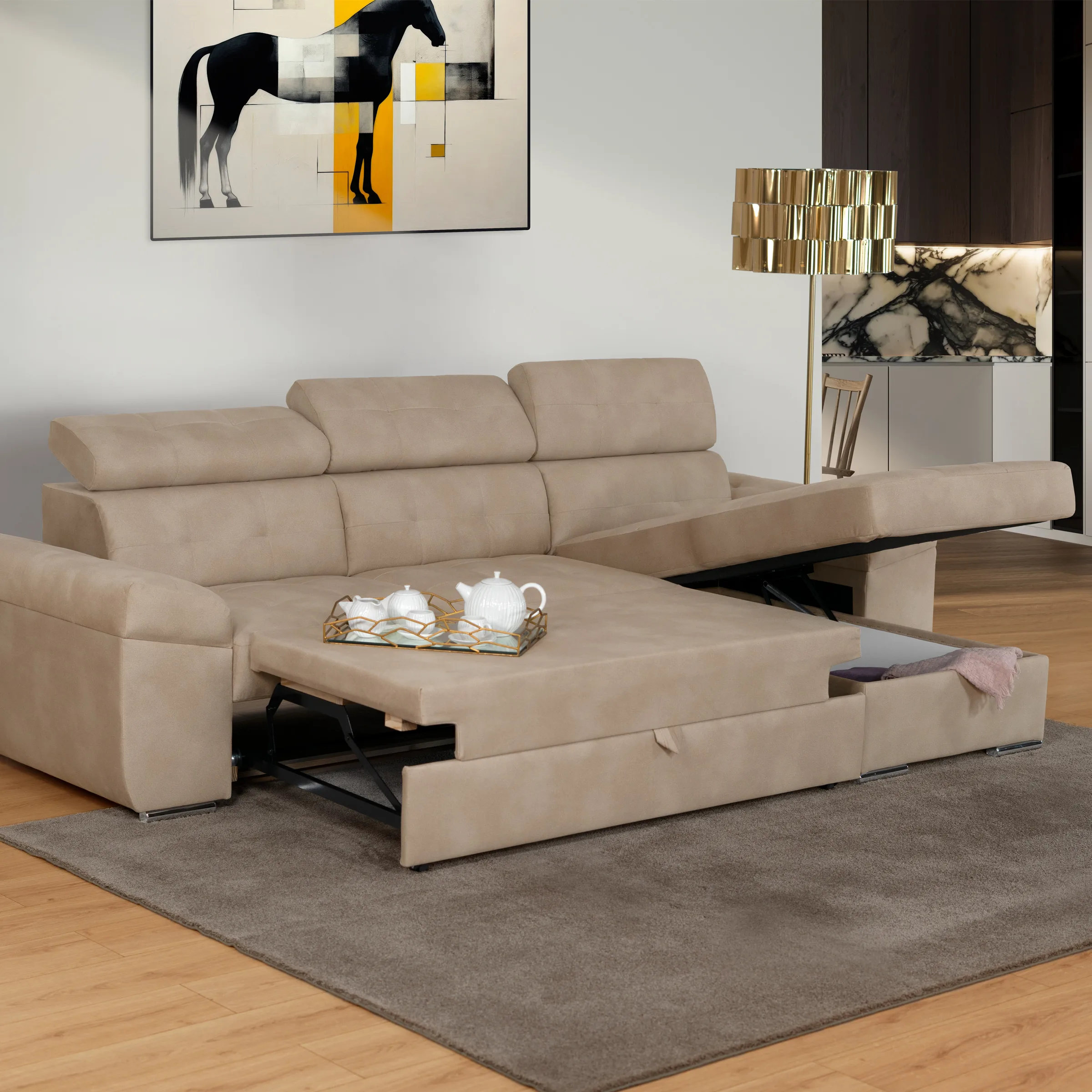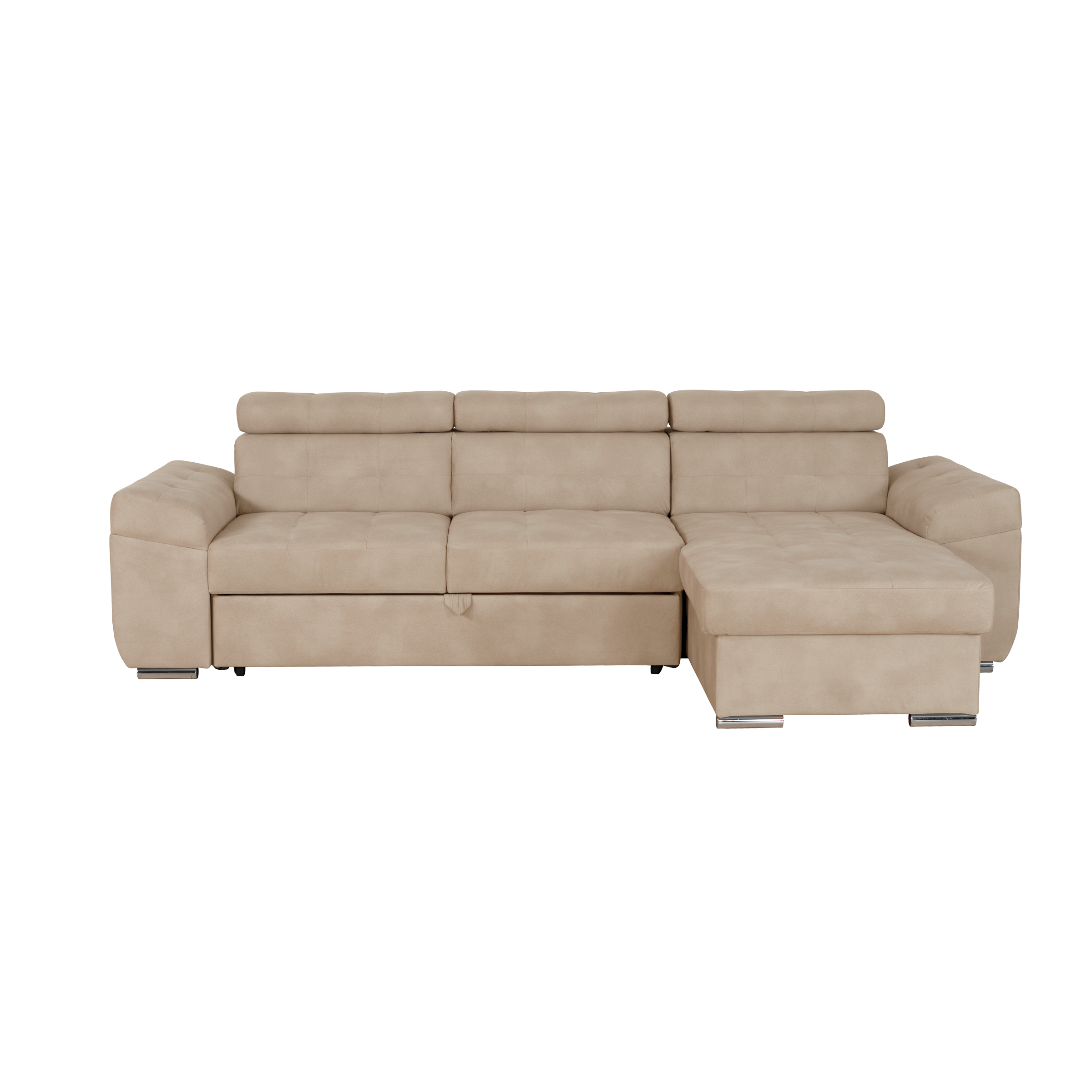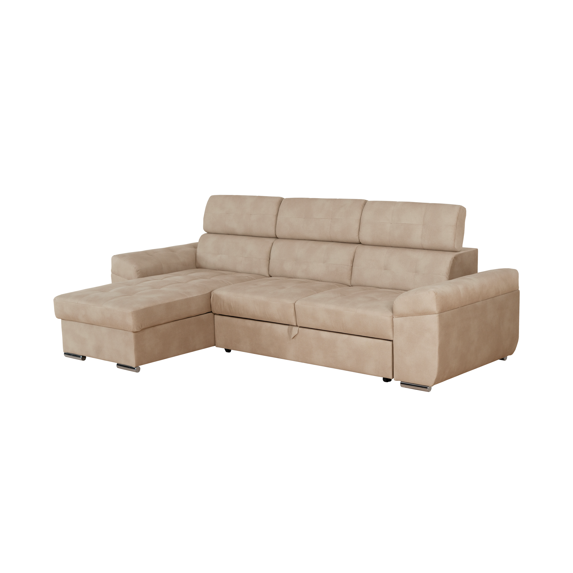 Sofá Eros 3 lugares com cama elevatória, chaise longue com baú e costas reclináveis. Design elegante e fácil manutenção.