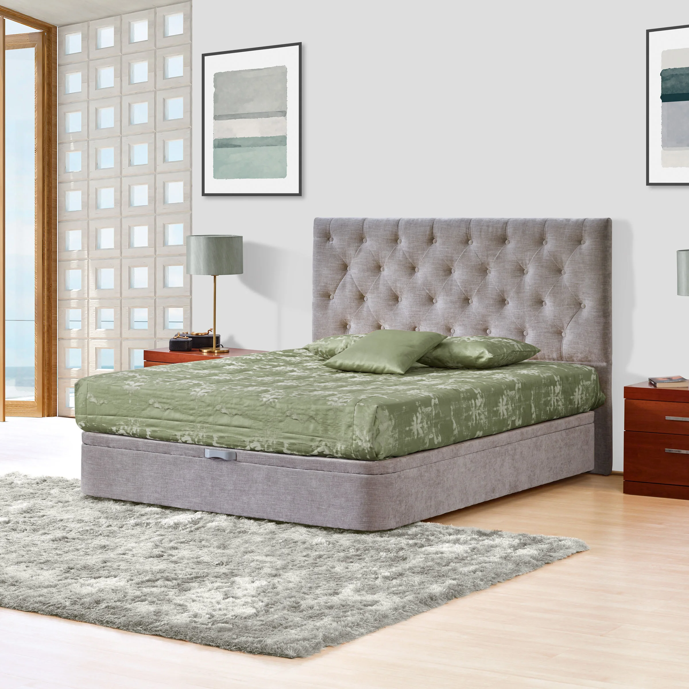 • Cabeceira estofada, com efeito clássico capitonê.