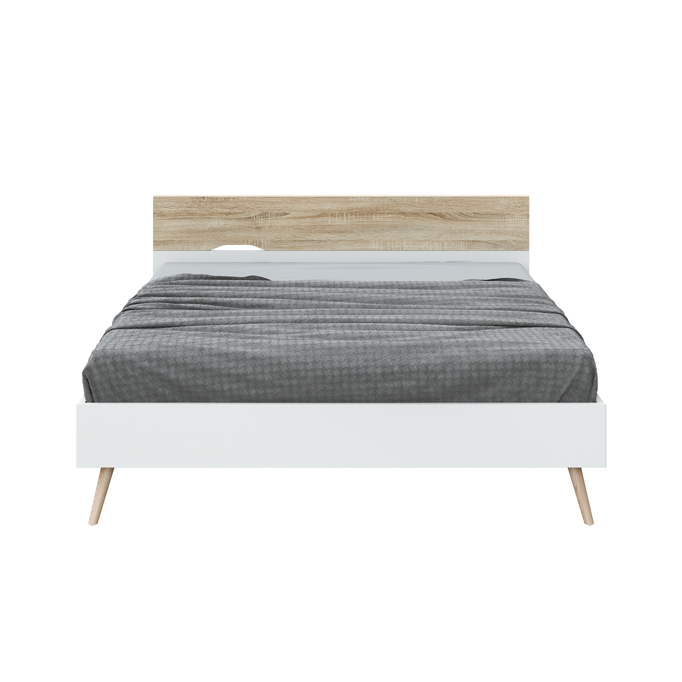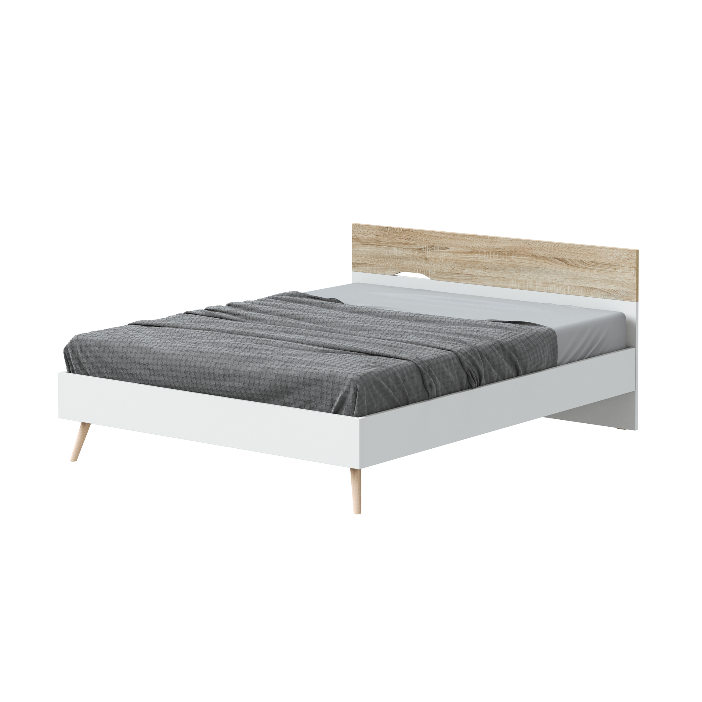 - Cama de casal, com design de inspiração nórdica, elegante, de linhas direitas e pés de madeira de freixo em cone inclinado.