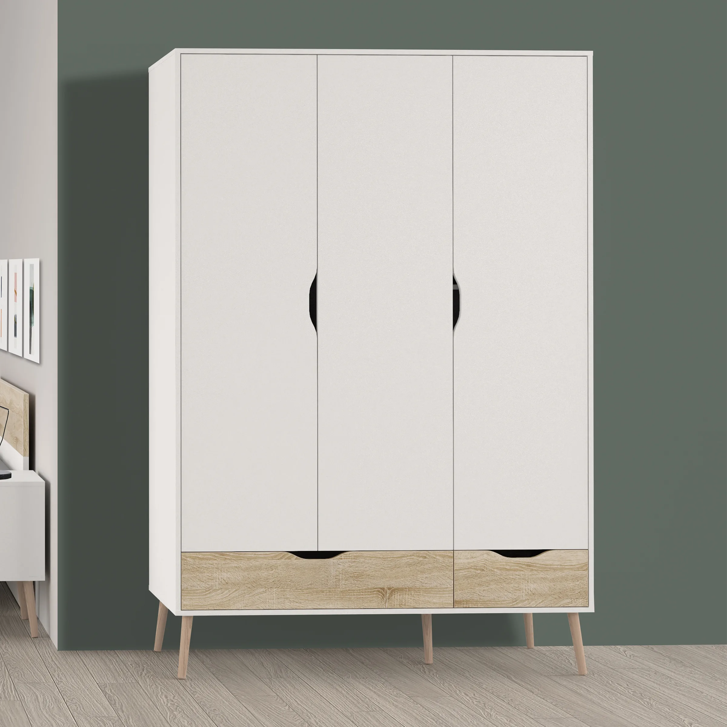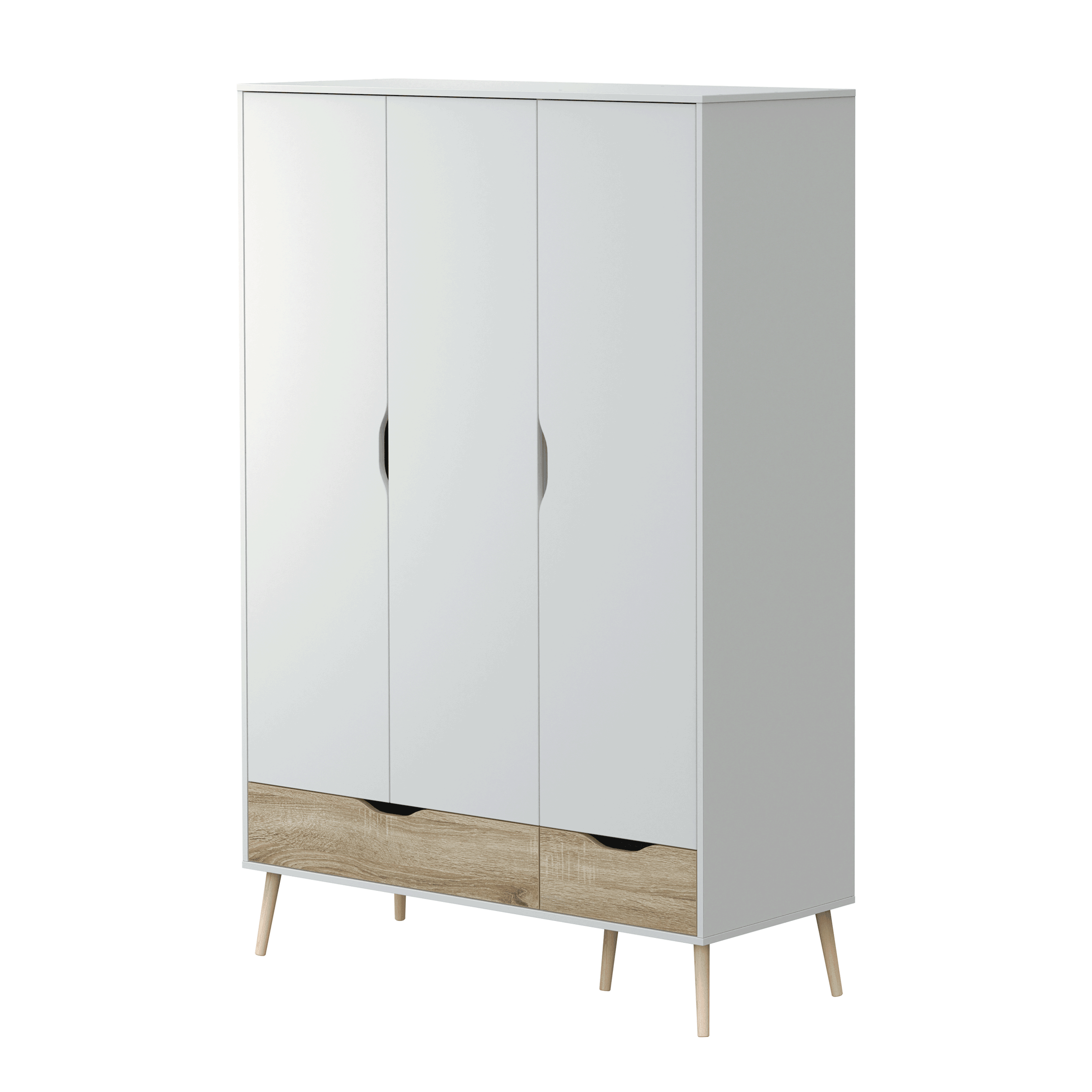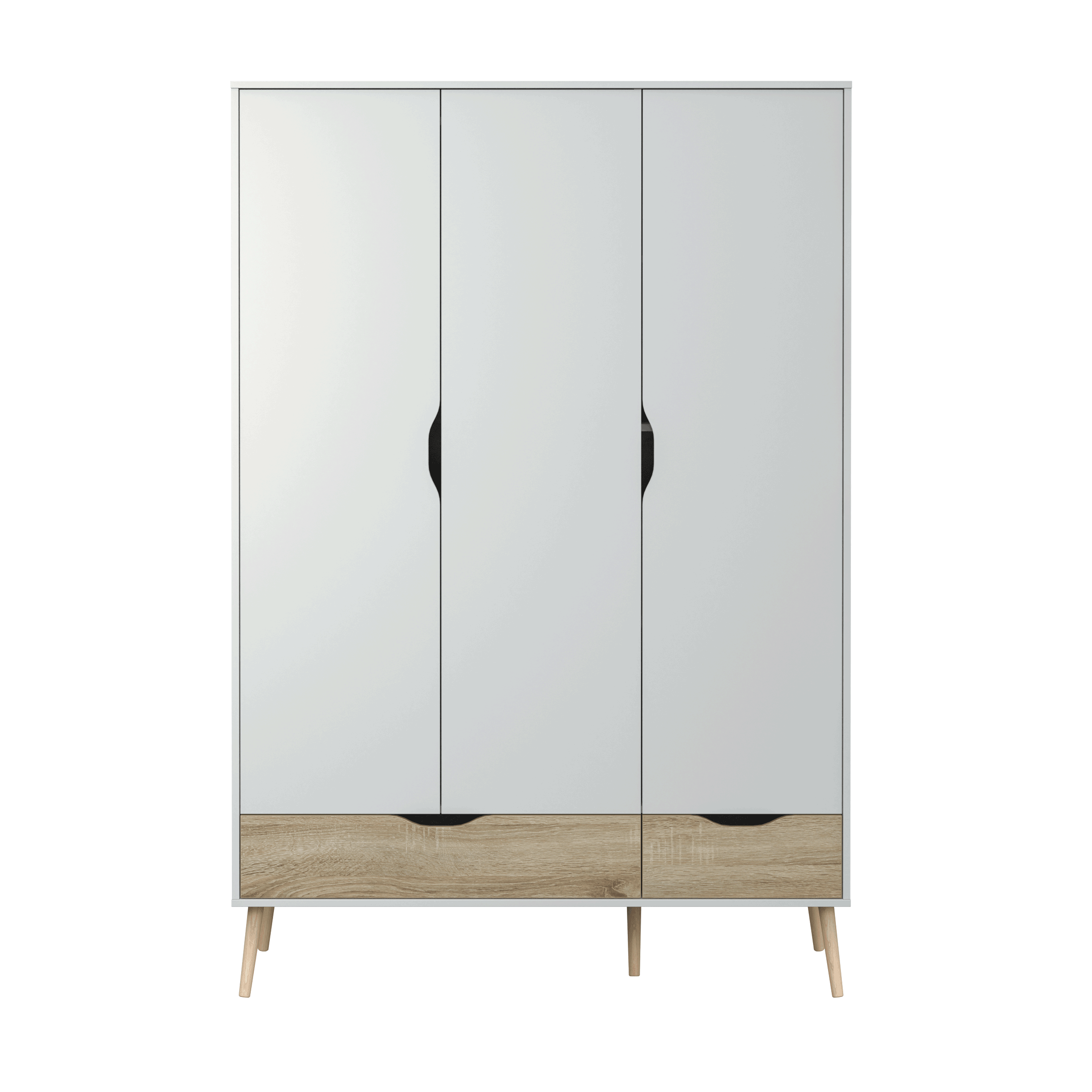• Com design de inspiração nórdica, linhas direitas, pés em cone inclinado, em madeira de freixo, e acabamento que conjuga o branco com o carvalho natura.